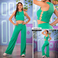 El conjunto tiene un diseño moderno, ideal para usar en diversas ocasiones, desde salidas informales hasta eventos más formales. El color verde de la tela de rib agrega un toque de frescura y naturalidad al conjunto, lo que lo hace perfecto para usar durante la primavera y el verano
