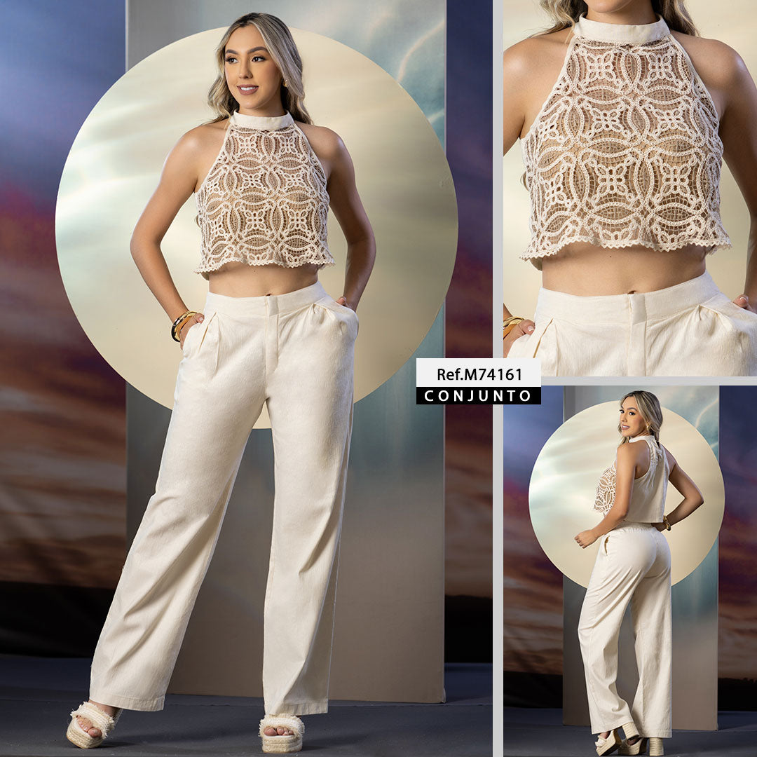 Conjunto sofisticado blusa crochet color beige, que destaca por su delicado trabajo de encaje y diseño halter que realza la figura. Se acompaña de unos pantalones anchos en tono crema, con cintura elástica para mayor comodidad, ofreciendo un look chic y relajado. Este conjunto es perfecto para eventos casuales de día o para una tarde de verano con estilo, manteniendo un equilibrio entre elegancia y confort.