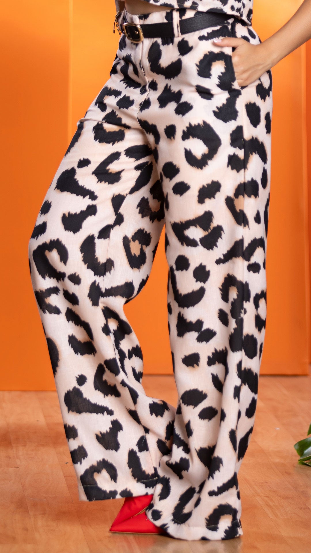 Conjunto de animal print en camel y negro destaca por su estilo y dinamismo. El diseño consta de una camisa de mangas cortas y corte cropped, combinada con pantalones de pierna ancha que realzan la figura. El conjunto completo está adornado con un cinturón a juego que acentúa la cintura, añadiendo un toque sofisticado y moderno. Perfecto para un look casual chic o una salida nocturna, este conjunto es tanto atrevido como elegante.