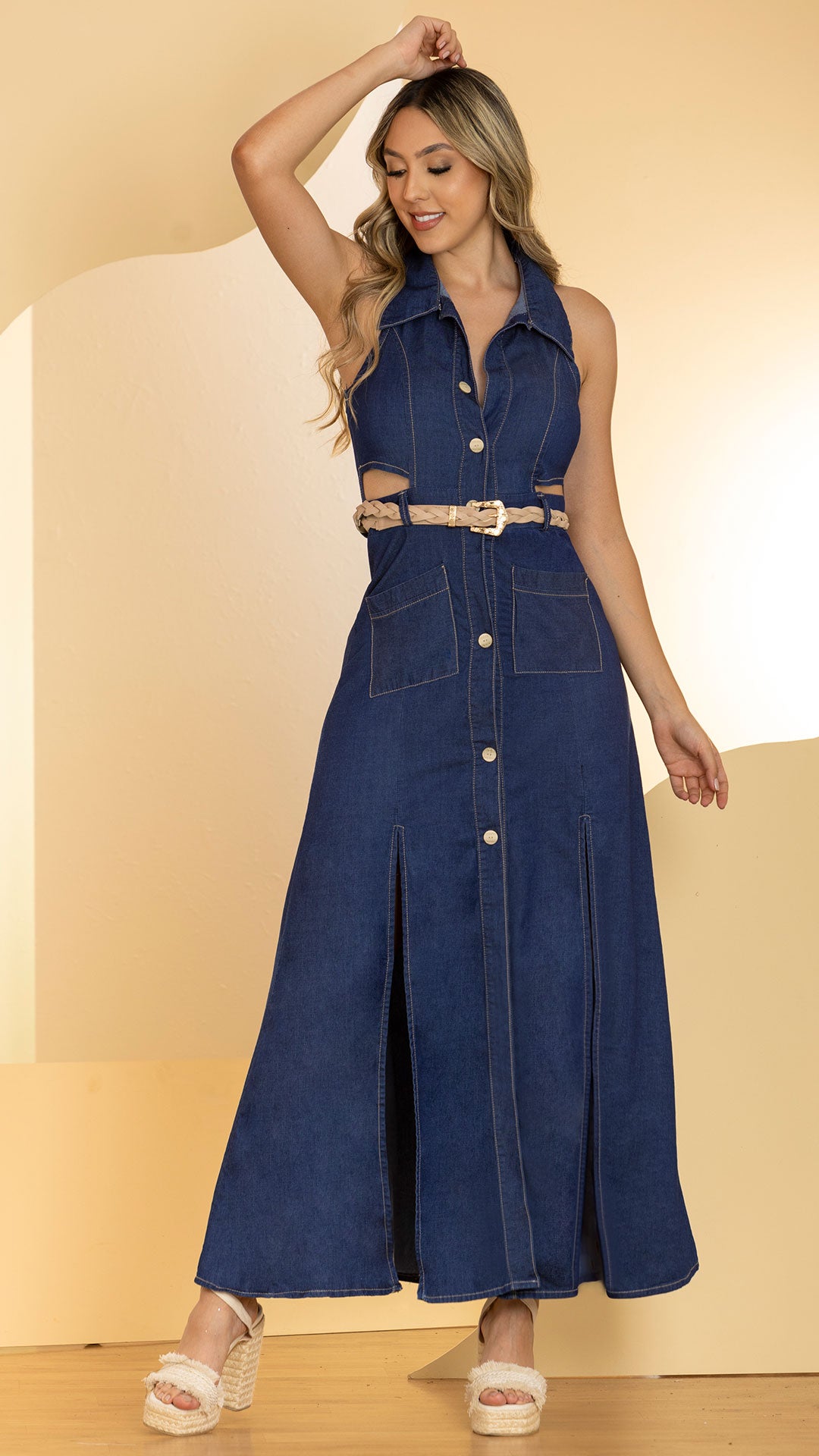 - Cinturón: Trenzado en tono natural que acentúa la cintura.