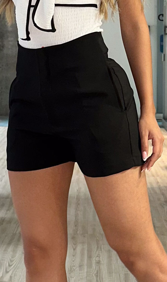 Short con un diseño minimalista y elegante en tono negro, ideal para ocasiones casuales o semiformales. Con una cintura alta que estiliza la figura, incluye prácticos bolsillos laterales y un corte ajustado que resalta las piernas. Perfecto para combinar con tops estructurados y tacones para un look moderno y sofisticado.