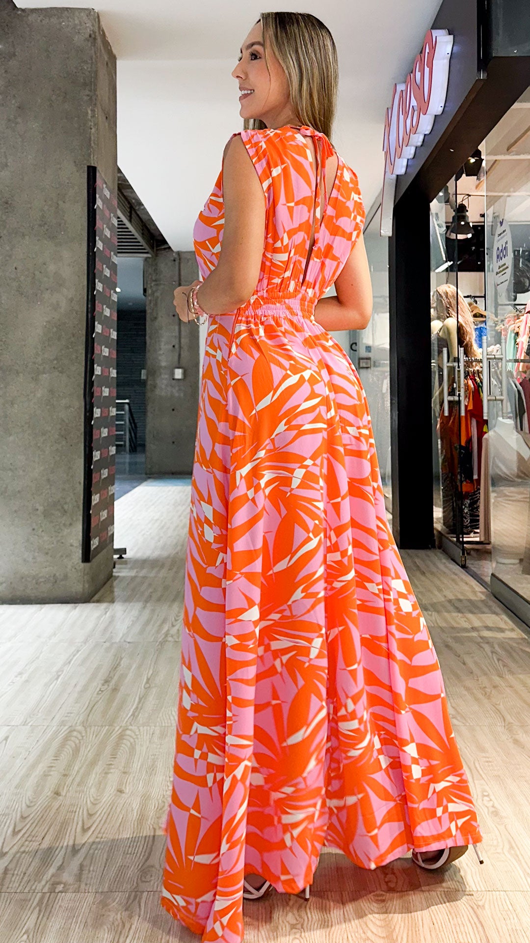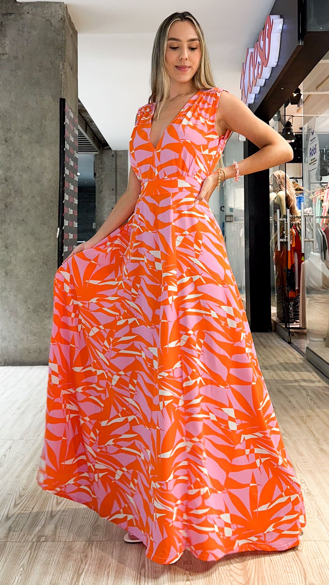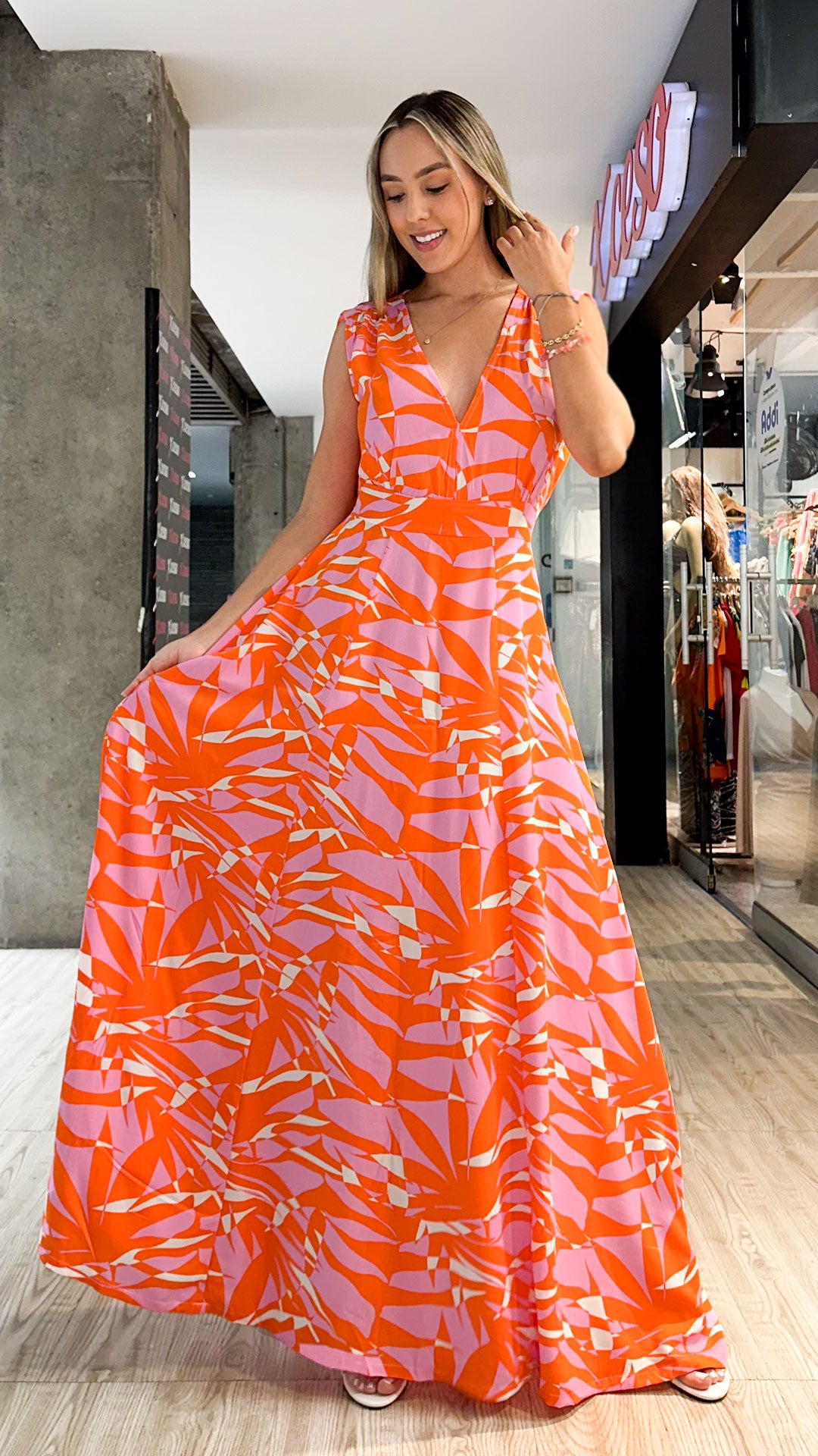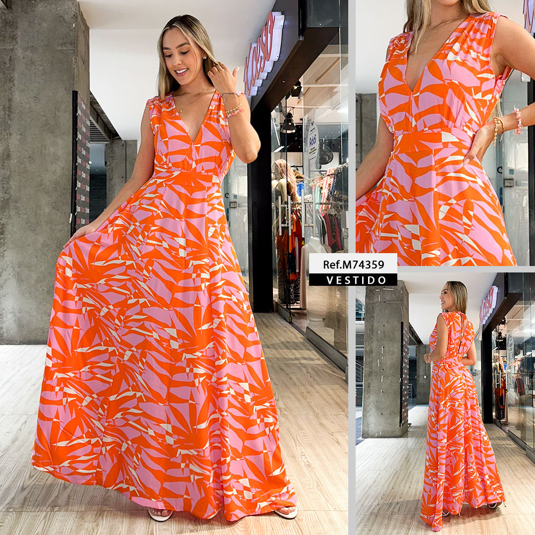 M74359 VESTIDO FALSO CHALIS ESTAMPADO NARANJA