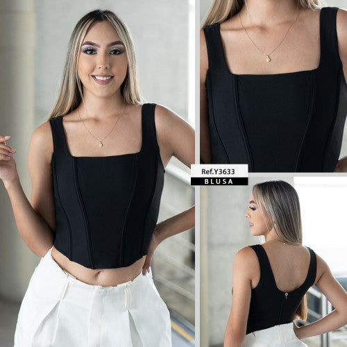 Blusa color negro sin mangas con paneles verticales que crean una silueta estructurada y contemporánea. Combinado con pantalones blancos, ofrece un contraste clásico y atemporal, perfecto para un look monocromático con un toque moderno