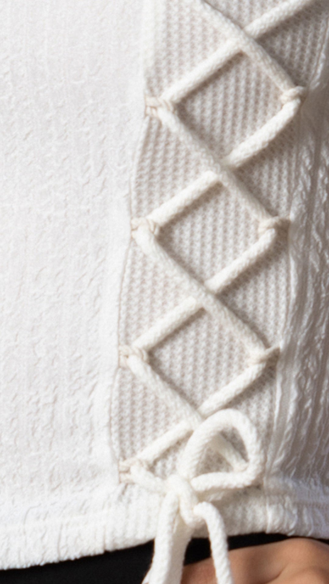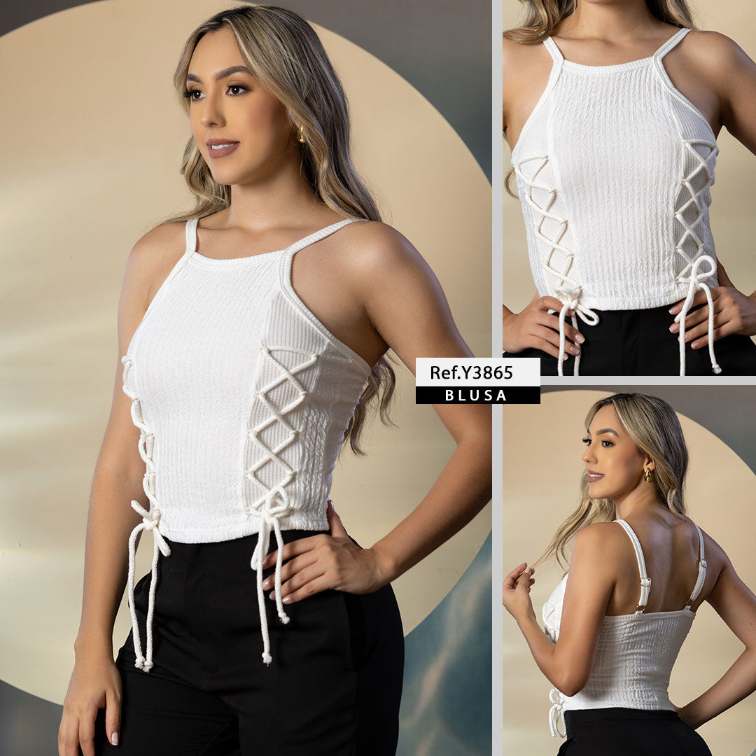 Blusa de color marfil presenta un diseño a la moda con detalles de cordones cruzados a un lado, aportando un toque bohemio y artístico. El tejido texturizado añade interés visual, mientras que su silueta sin mangas y el ajuste ceñido hacen de esta pieza un complemento ideal tanto para atuendos casuales como más arreglados, manteniendo un estilo juvenil y fresco