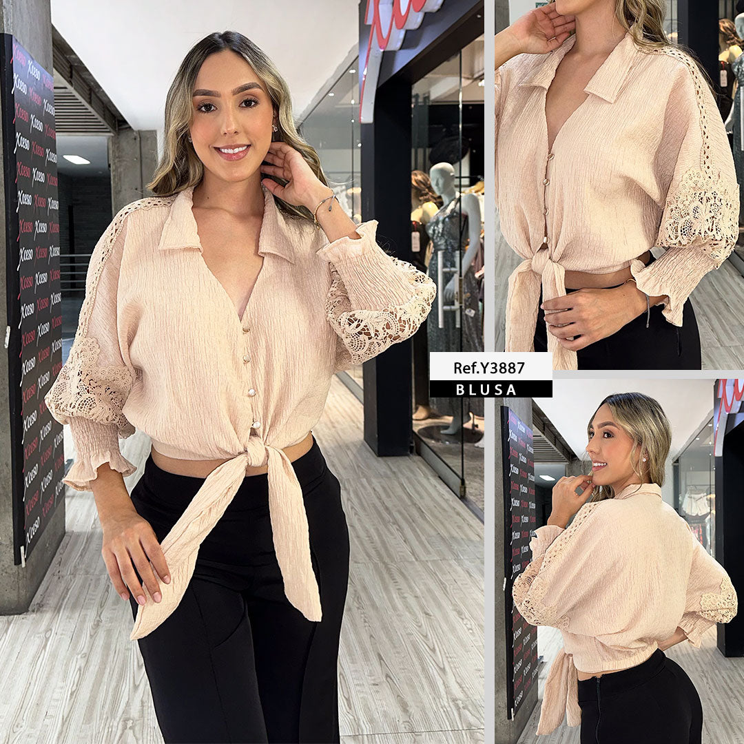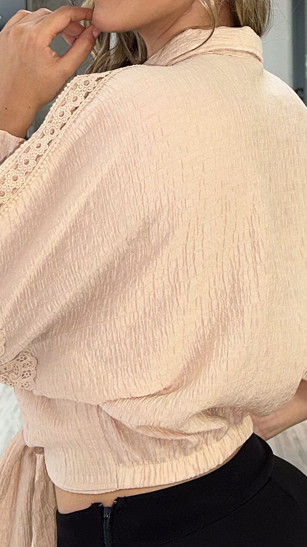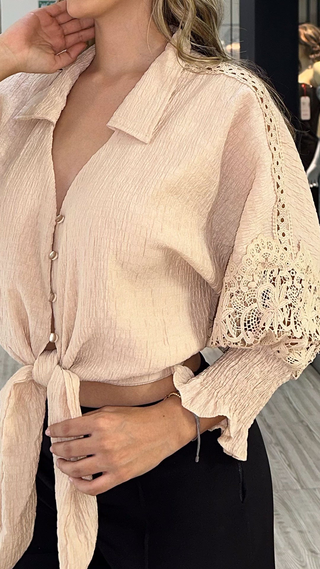 Blusa de color camel, con un diseño contemporáneo y femenino. Sed estaca por sus mangas acampanadas adornadas con inserciones de encaje delicado, añadiendo un toque romántico y sofisticado. La blusa tiene un corte relajado con un nudo en la parte frontal, lo que le da un aire casual y chic. El tejido de textura ligera y el escote en V complementan el estilo veraniego y versátil de la prenda, ideal para combinar tanto con jeans como con faldas para diferentes ocasiones.