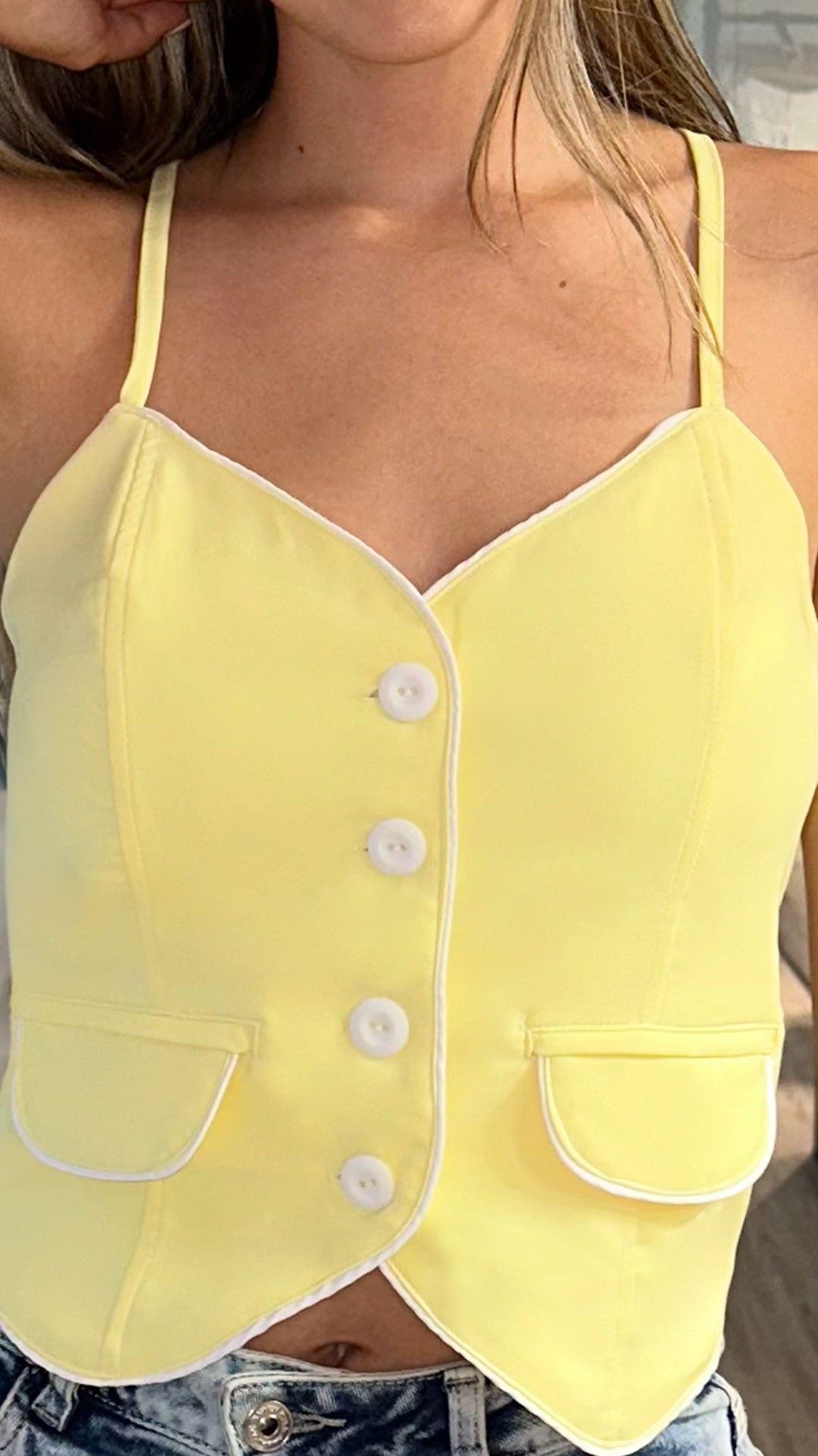 Blusa prenda elegante y sofisticada en tono amarillo, con un diseño estructurado de tirantes delgados. Los detalles de ribete en contraste blanco en los botones y bolsillos aportan un toque moderno y chic, ideal para un look formal o casual sofisticado. Su corte ajustado resalta la figura, y su diseño versátil la hace perfecta para combinar tanto con pantalones como con faldas. ¡Un básico imprescindible para cualquier armario con un toque de distinción!