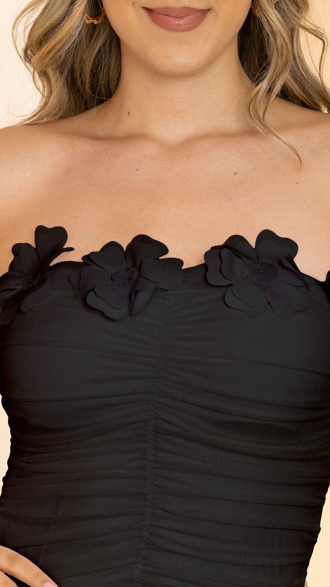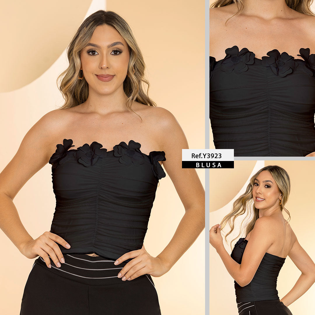 Blusa estilo top strapless en color negro destaca por su diseño ajustado y fruncido, con detalles florales en relieve a lo largo del escote que le añaden un toque delicado y femenino. Perfecta para ocasiones especiales o una salida de noche, su corte resalta la silueta y combina fácilmente con prendas elegantes o casuales.
